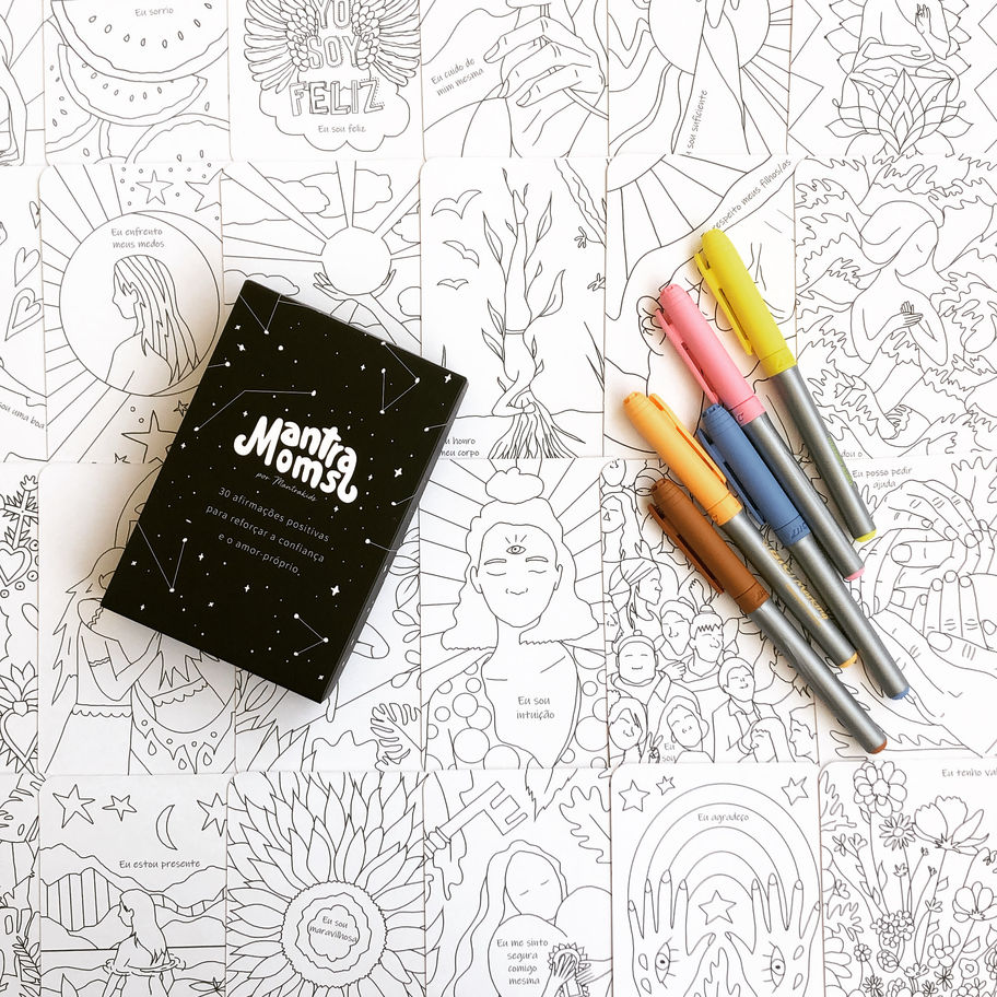 Pintar é terapia e para ajudar as mães a mentalizar a afirmação, no verso de cada carta há uma linda ilustração para colorir, capturando sua essência, dando a cada ilustração, um significado especial.